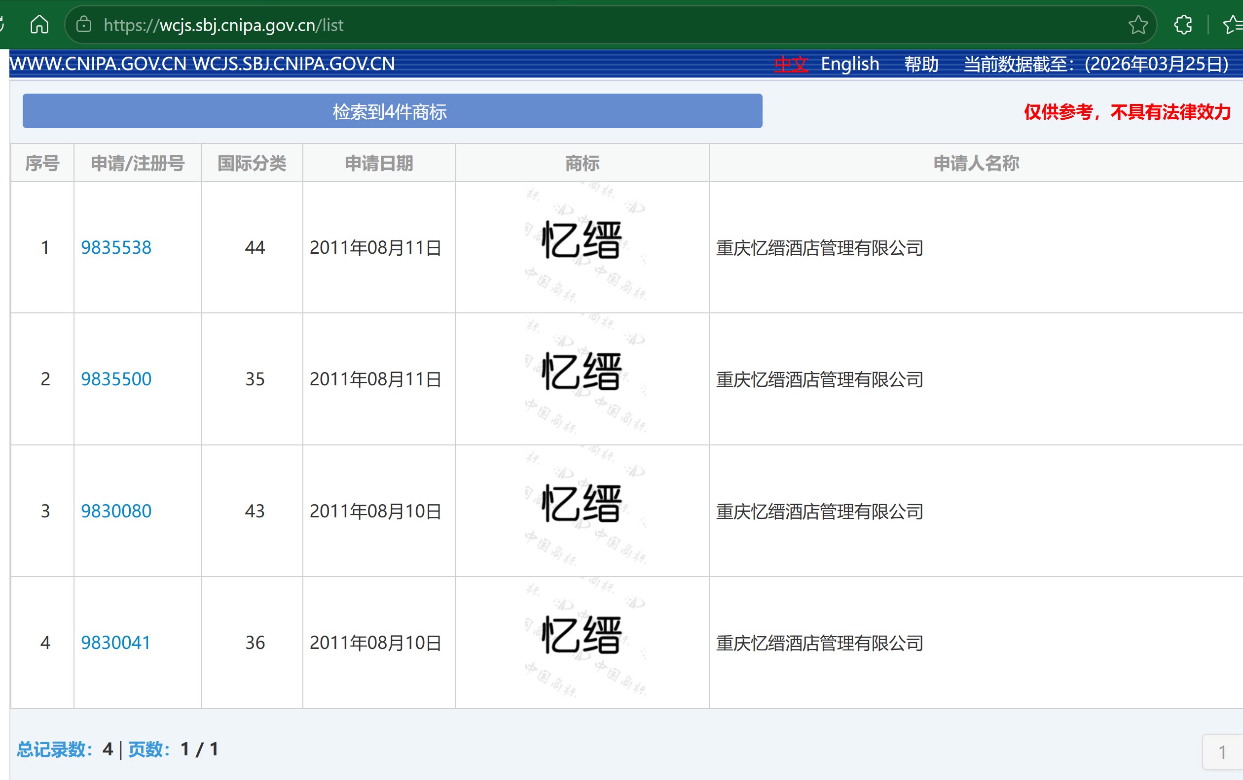 1. 此次拍卖商标信息为国家知识产权局商标局官网查询所得,重庆忆缙酒店管理有限公司名下有注册商标4个,该结果仅供参考,商标情况以实际查询情况为准。