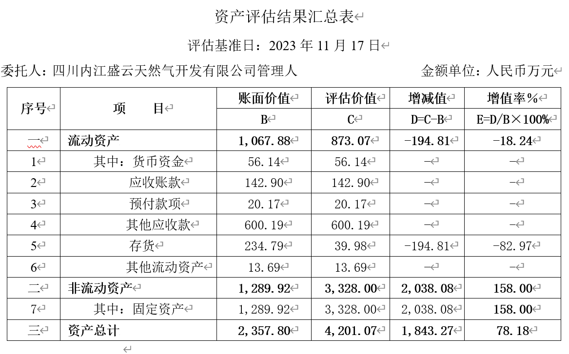 重整资产范围为川蜀地资评报字(2024)第0202号《评估报告》载明的盛云天然气公除应收账款、存货、货币资金等外的非流动资产。评估结果如下: